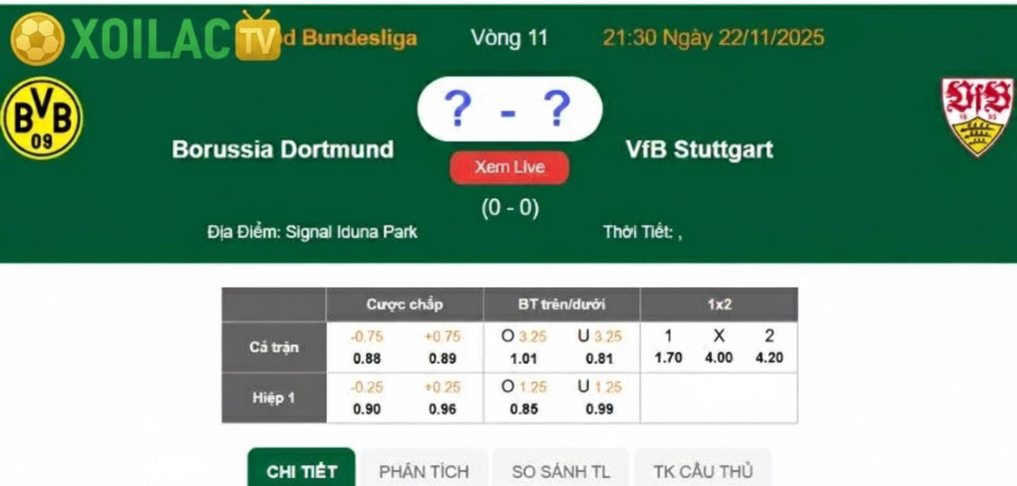 Đội bóng vùng Ruhr luôn chơi rất thăng hoa trước sự cổ vũ của khán giả nhà. Tuy nhiên, mức kèo này cũng tiềm ẩn rủi ro không nhỏ cho những ai tin tưởng vào Dortmund. Lịch sử đối đầu gần đây đang hoàn toàn chống lại họ, khi Stuttgart đã thắng kèo châu Á ở cả 5 lần gặp nhau gần nhất. Phong độ của Stuttgart cũng không hề tệ. Do đó, lựa chọn Stuttgart được chấp 0.75 có thể là một phương án an toàn.