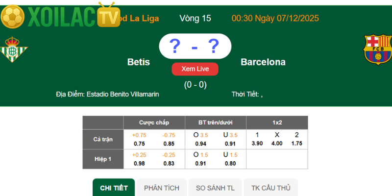 Mức kèo chấp 0.75 trái dành cho Barcelona là hoàn toàn có cơ sở khi nhìn vào hàng công đang nhả đạn đều đặn của họ. Dù Real Betis đang chơi tốt, nhưng việc đối đầu với một Barca vừa làm gỏi Atletico Madrid sẽ là thử thách quá tầm với hàng thủ đội chủ nhà. Đặt niềm tin vào Barcelona là lựa chọn sáng suốt bởi họ cần duy trì mạch thắng để đua vô địch, đồng thời đẳng cấp ngôi sao sẽ là yếu tố định đoạt trận đấu.